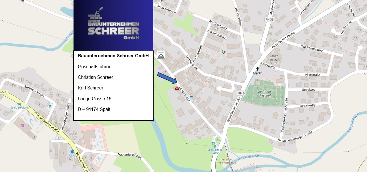 Kontaktdetails ÖffnungszeitenMo. – Fr. von 07:00 – 18:00 Uhr Telefon Tel:. 0151- 2702 9466 Adresse Bauunternehmen Schreer GmbHLange Gasse 16D – 91174 Spalt Kontaktformular Senden Sie uns völlig unverbindlich Ihre Anfrage oder rufen Sie uns an. Mit einem * gekennzeichnete Felder sind Pflichtfelder. Ihr Name* Ihre E-Mail* Telefonnummer wenn Rückruf erwünscht. Ihre Nachricht* *(Pflichtfeld) Mit dem Absenden des Kontaktformulars erklären Sie sich freiwillig damit einverstanden, dass Ihre Daten von Bauunternehmen Schreer GmbH gespeichert werden um Sie zu kontaktieren oder Ihre Anfrage zu bearbeiten. Weitere Informationen und Hinweise zum Widerruf finden Sie in den Datenschutzbestimmungen. Bitte lasse dieses Feld leer. Ihr Weg zu uns!